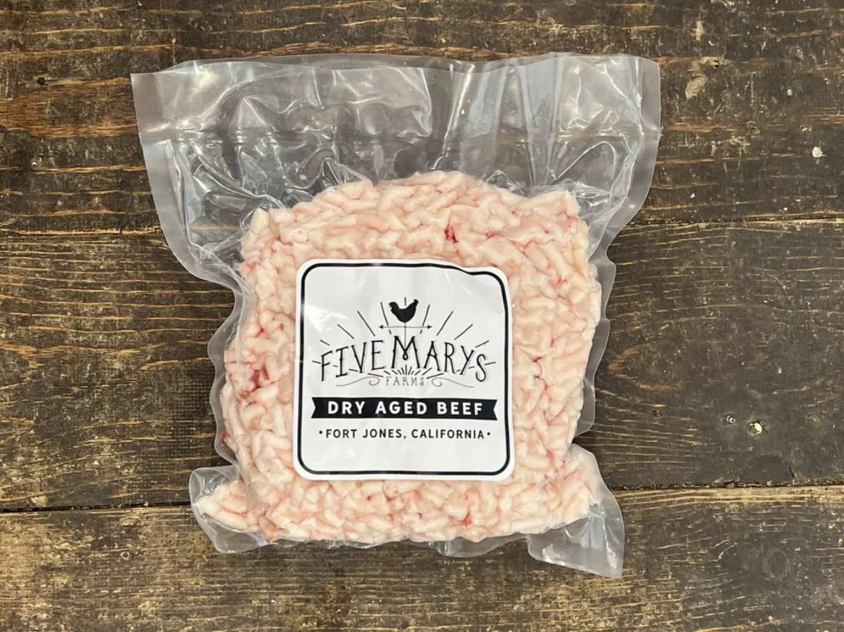Start with a package of Five Marys Pasture Raised Natural Beef Tallow and ‘wet render’ it in a large cast-iron pot on very low heat. Add two inches of water to the pot and a tablespoon of salt for every pound of fat. Strain out the meaty bits as they arise in the pot.